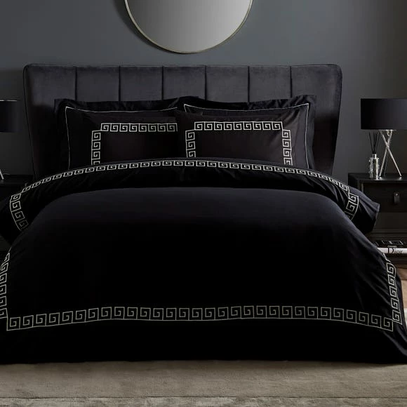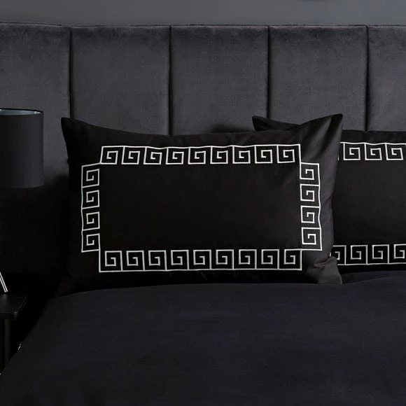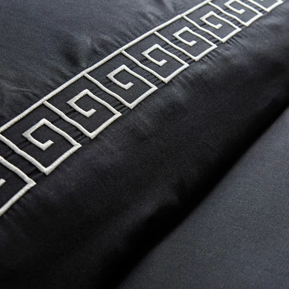 An elegant black colourway duvet cover and pillowcase set with a beautiful embroidered greek key border design. This duvet set is crafted from a soft 100% cotton sateen fabric which is lovely and soft. There are matching oxford pillowcases available to purchase separately. This Hotel Greek duvet cover and pillowcase set is also available in a white colourway.