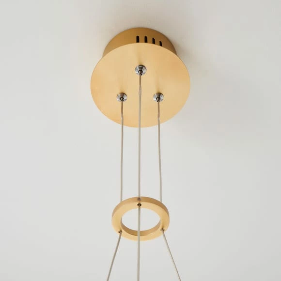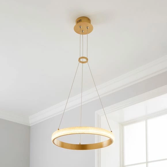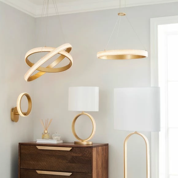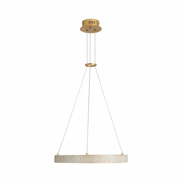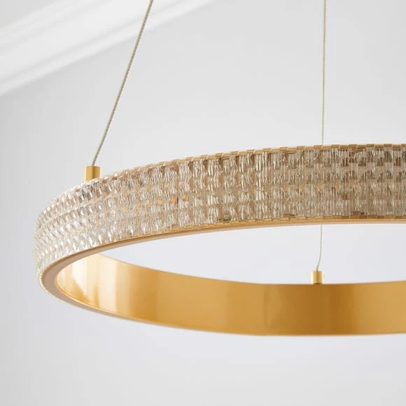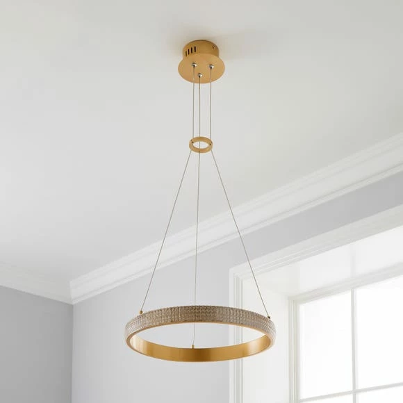 Add a glamorous touch to your home with the Hotel Harrogate 1 Light Ceiling Light. Featuring a suspended gold hoop with a crystal effect LED integrated within the light, finished with a striking gold base and a height adjustable silver cable. The Hotel Harrogate Ceiling Light is the perfect piece to add a luxurious feel to your interior, pair with available matching family items to complete the look.