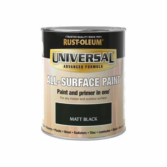 The Universal All-Surface Matt Paint in black from Rust-Oleum is highly durable and suitable for both interior and exterior surfaces. This paint offers an advanced brush-applied paint and primer in one making it perfect for getting excellent coverage on any furniture or household project.